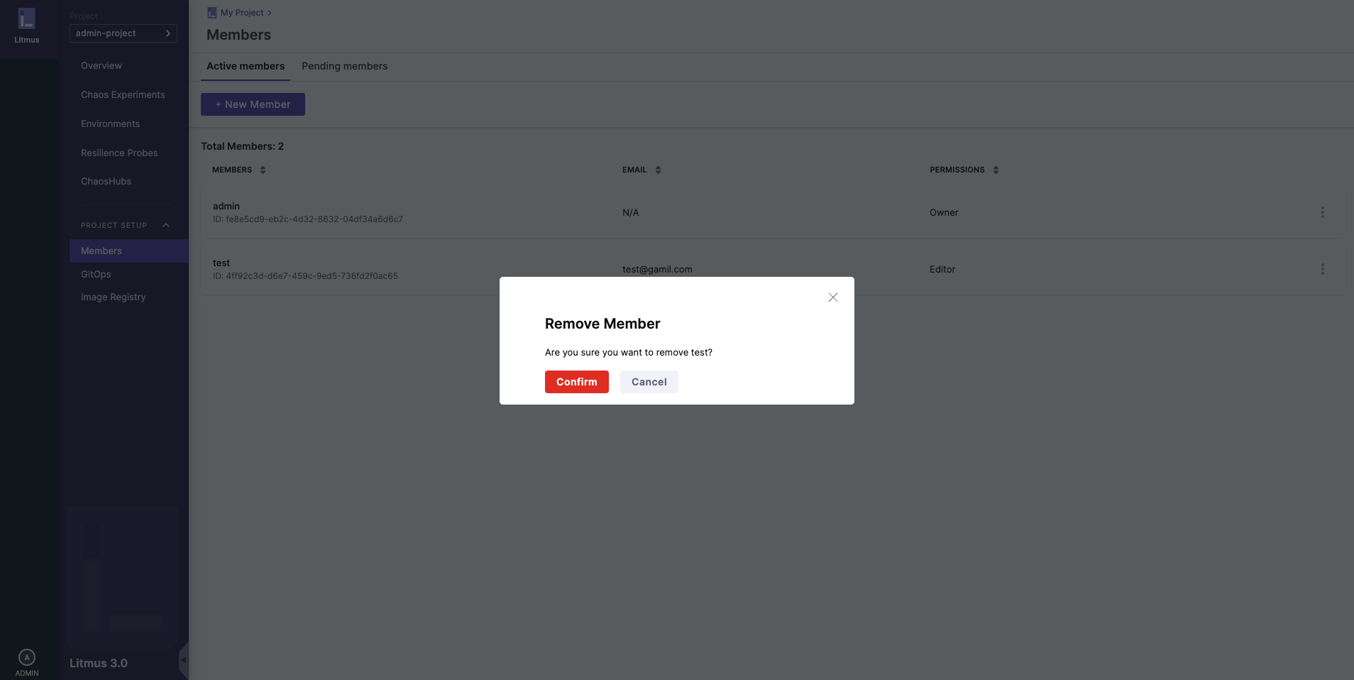 On hitting the Remove Member option, you will be prompted to confirm the removal of the member, hit Confirm to confirm and remove the member from your project.